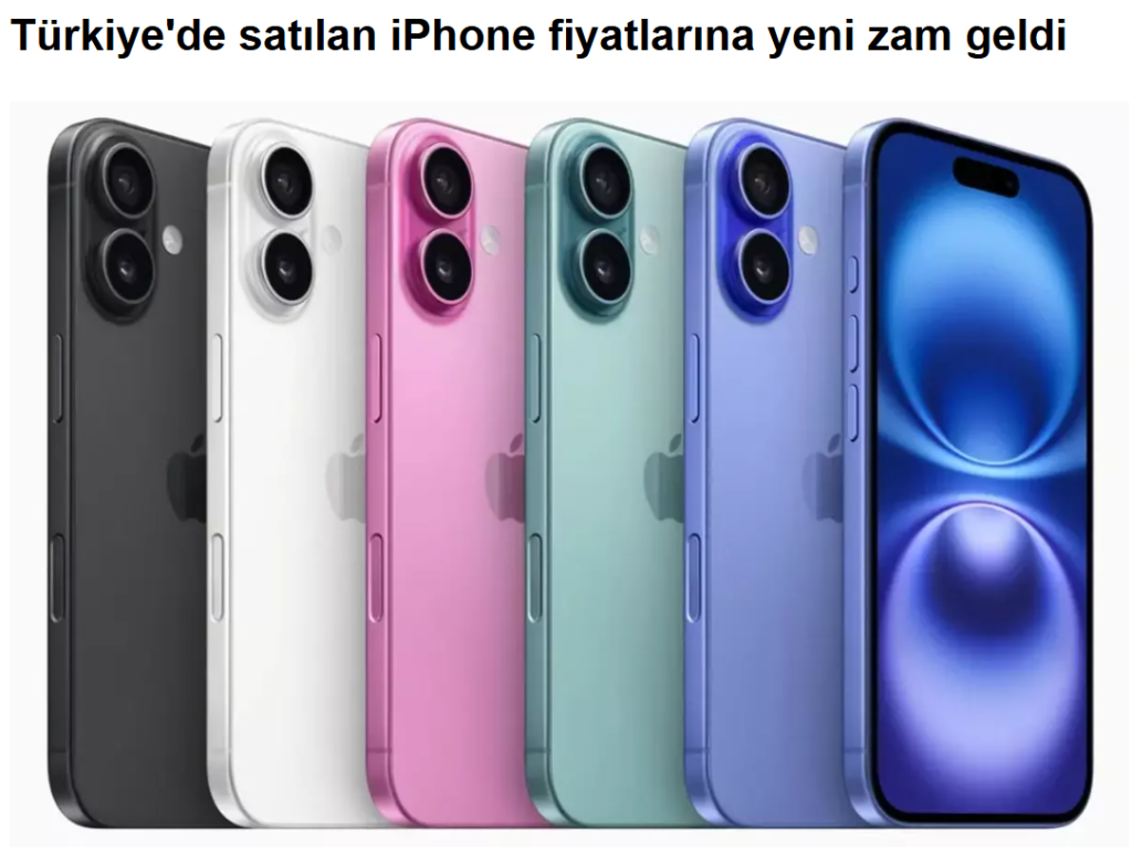 iPhone 16’nın başlangıç fiyatı %7,69 oranında artışla 64.999 TL’den 69.999 TL’ye, iPhone 16 Pro’nun başlangıç fiyatı %8,43 zamla 82.999 TL’den 89.999 TL’ye, 19 Şubat 2025 tarihinde tanıtılan iPhone 16e’nin fiyatı ise %4,16 zamla 47.999 TL’den 49.999 TL’ye yükseldi.